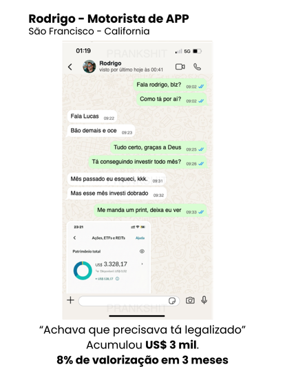 Brasileiros comuns, como você, começaram com menos de US$ 500/mês e hoje veem seus investimentos crescerem mês após mês em dólar.